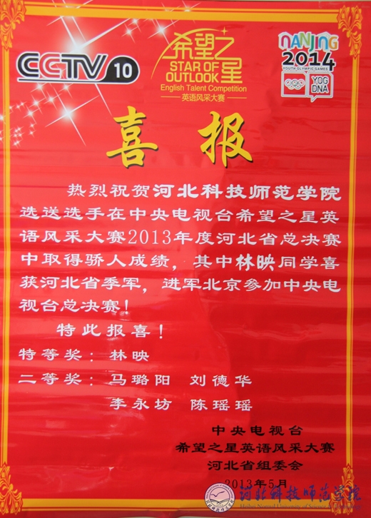近日,best365在河北省希望之星英语风采大赛总决赛中表现优异,其中外国语学院学生林映获得河北省季军,将进军北京中央电视台参加总决赛。另有马璐阳、刘德华、李永坊、陈瑶瑶四名同学获得二等奖。(编辑:孙艳敏        审稿:田 毅)