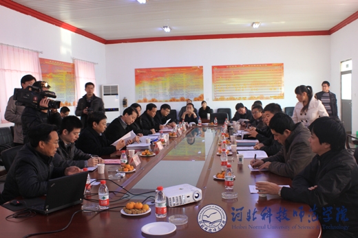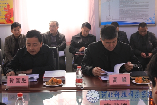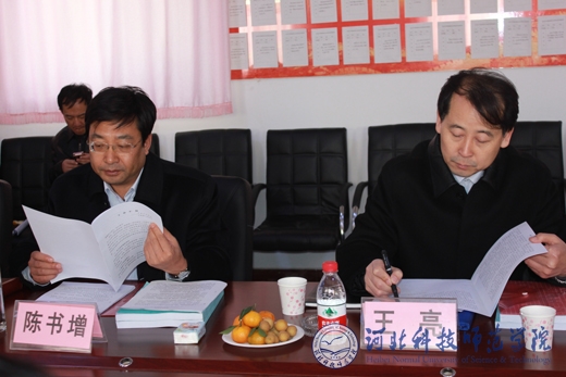 河北省委组织部副部长王亮(中)与校党委副书记王同坤(右一)、卢龙县委书记孙国胜(左一)研究驻村工作