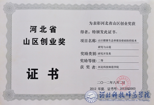 2012年8月20日,河北省科学技术厅公告了2012年度河北省山区创业奖励的决定(冀科山〔2012〕2号),本年度共评审出河北省山区创业奖二等奖6项,三等奖34项,一等奖空缺。best365动物科技学院马增军教授主持完成的《山区健康生态养猪及疫病防控技术研究与示范》研究成果,荣获河北省山区创业奖二等奖。(编辑:孙艳敏     审核:田毅)