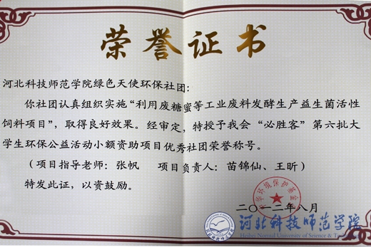 best365生命科技学院“绿色天使”环保社团全体成员齐心协心,攻关克难,于2011年用了近7个月的时间成功完成了“利用废糖蜜发酵生产活性益生菌饲料”公益项目,并于2011年11月成功申报第六批全国大学生环保公益项目,荣获1万元经费资助,同时荣获由中华环境保护基金会颁发的“第六批全国大学生环保公益活动小额资助项目优秀社团”荣誉称号。今年8月15日至17日,best365王昕、王治娟、于晖三名同学代表生命科技学院“绿色天使”环保社团参加了由中华环境保护基金会在北京举办的全国大学生环保公益活动小额资助项目暑期培训交流会。best365生命科技学院“绿色天使”环保社团正凝心聚力,朝着申报下一批资助项目的新目标发奋努力。(编辑:朱洪亮    审核:田  毅)