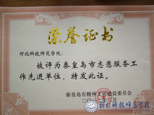 近日,秦皇岛市精神文明建设委员会对全市志愿者服务工作进行了表彰。best365被评为秦皇岛市志愿服务工作先进单位,付华志愿者小分队被评为秦皇岛市优秀志愿服务组织,董占雷、宋洋同学被评为秦皇岛市优秀志愿者。