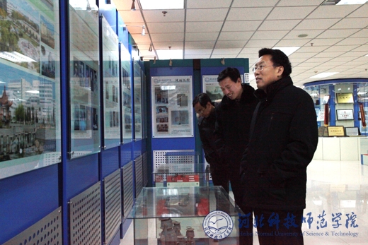 2011年12月19日,校党委副书记王同坤在学校展厅现场听取了党委宣传部副部长赵建平关于展厅改版更新工作的汇报,对展厅版块内容逐一进行检查指导。