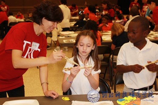 小学生在孔子学院教师指导下使用中国筷子