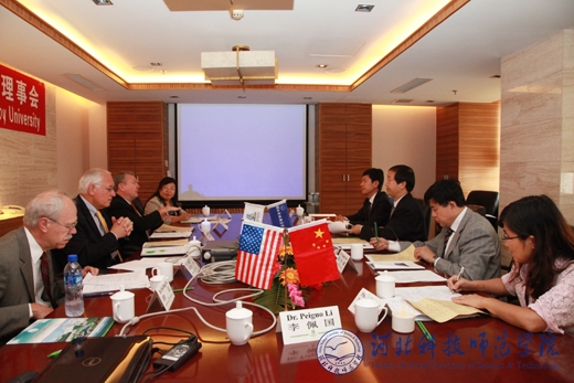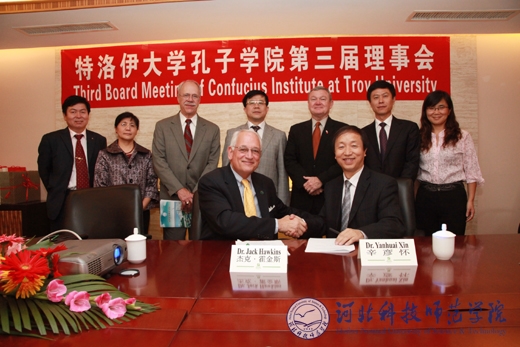9月14日,孔子学院第三届理事会会议正式召开。美国特洛伊大学校长杰克·霍金斯,副校长厄尔·英格拉姆、柯蒂斯·波特,中国国际青年交流中心副主任阎学谦,best365校长辛彦怀,国际合作与交流处处长东方阳,孔子学院中方院长陈晓枫出席理事会会议。会议提名并确认了辛彦怀校长为理事会副会长,孔子学院中方院长为理事会成员;确定了孔子学院院长及其任期责任目标;通过了孔子学院及孔子课堂战略发展计划;确定了优惠交换生项目,对等接待访问学者、定期开展教学和科研及学术交流,开设远程优质课程教学,为交换生提供预科等双方合作办学项目的进一步推进;确定了特洛伊大学“阿拉巴马州中国周”活动,特洛伊大学孔子学院新楼落成仪式,第四届理事会召开等各项活动事宜。最后,best365校长辛彦怀和美国特洛伊大学校长杰克·霍金斯共同签署了双方合作发展备忘录。