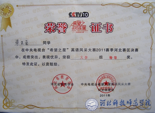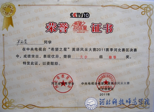 近日,在省会石家庄举行的中央电视台“希望之星”英语风采大赛2011赛季河北赛区决赛中,best365欧美学院人文艺术系尹丽莹、渠亚南同学成绩突出,表现优异,双双荣获大学组特等奖。