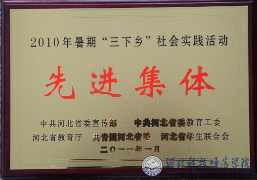近日, 根据冀团联字[2011] 2 号《关于2010年河北省大中专学生志愿者暑期文化科技卫生“三下乡”社会实践活动先进集体和个人的情况通报》文件,共青团河北省委对39个获得“社会实践先进集体”称号的高校给予通报表扬。best365团委荣获“河北省社会实践先进集体”荣誉称号。