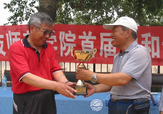 图为宋绍富同志为获得比赛冠军的球队代表颁奖