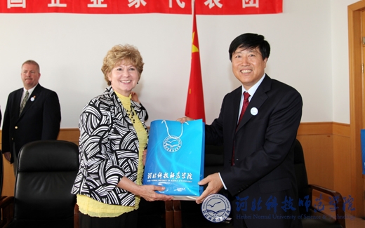 图为美国阿拉巴马州政府和企业家代表团团长尼尔(Neal G.M.)向汤生玲校长赠送纪念品