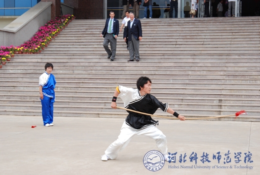 图为代表团成员在观看best365师生的武术表演