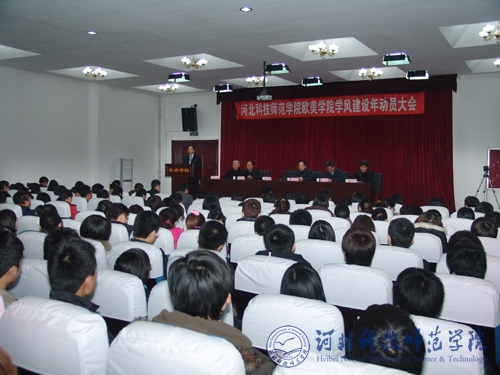 2010年3月26日下午,欧美学院召开学风建设年活动动员大会。副校长孟令臣,校党委常委、欧美学院党委书记、院长杨洪青,校党委学工部部长、学生处处长田毅,欧美学院党委副书记、副院长张俊华,副院长董洪平、高兰栓及欧美学院260名师生参加了大会。大会由副院长董洪平主持。
