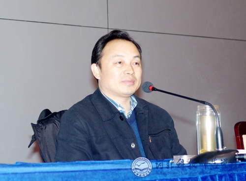 图为检查组组长、省教育厅副巡视员李胜利同志在会上讲话