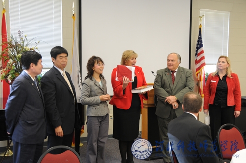 我方团长为阿拉巴马州议员赠校旗