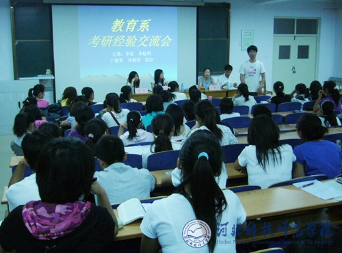 2009年6月18日晚,教育系考研经验交流会在开发区校区举办。2005级教育技术专业5名考取研究生的同学在会上畅谈了自己的考研经验。他们根据自身四年来的学习、生活体会,分别就生活作息、信息搜集、调剂技巧、调整心态、考研复试、怎样合理分配时间等问题作了详细介绍,并现场解答了同学们的提问。