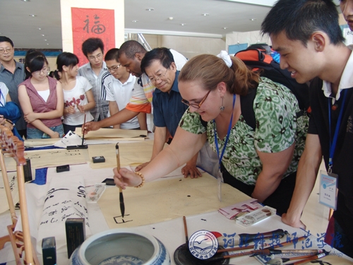 图为来访师生在学练中国书法