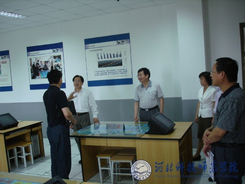图为孟令臣副院长一行在河北经贸大学实验室考察