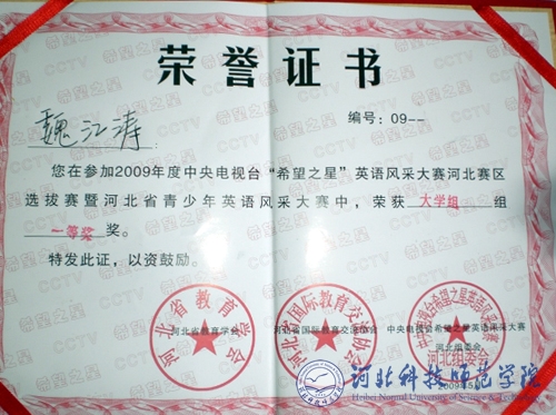 外国语学院魏江涛同学荣获2009年CCTV“希望之星”河北赛区英语风采大赛一等奖