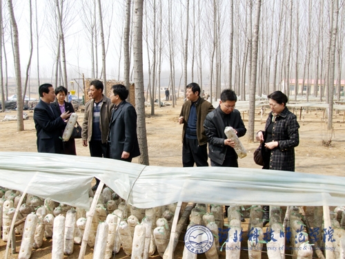 2009年4月8日,科研处处长杨越冬教授与秦皇岛市科技局韩瑞凤副局长、北戴河区科技局张新志局长及best365相关专业教师一行九人到北戴河区戴河镇食用菌养殖基地进行调研。