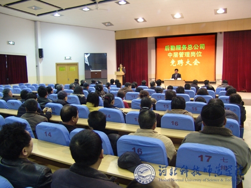 2009年3月13日,后勤服务总公司分别在秦皇岛校区和昌黎校区召开中层管理岗位竞聘会议。17名同志积极报告参加中层管理岗位竞聘。后勤服务总公司全体职工参加了会议。