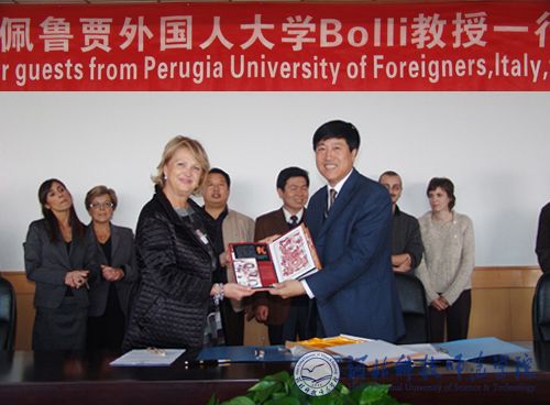 图为院长汤生玲教授在签字仪式结束后向意大利佩鲁贾外国人大学Bolli教授赠送纪念品