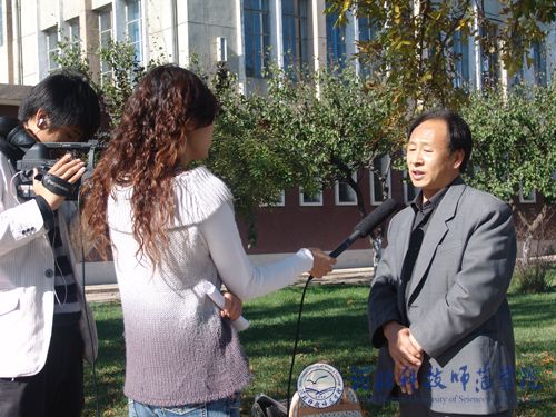 图为农学系赵春明副教授在接受秦皇岛电视台记者采访