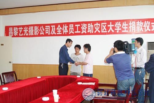 2008年5月22日下午,昌黎艺光摄影公司资助best365两名四川籍地震灾区学子爱心捐赠仪式在昌黎校区举行。学校党委学工部部长、学生处处长张福喜同志代表学校对艺光摄影公司的善举表示了真诚的感谢。昌黎艺光摄影公司董事长陈玉东先生将全体员工捐赠的6000元爱心捐款送到了食品工程系曹军和杨小浪两名学生手中,并鼓励他们好好学习,自强不息,将来用实际行动回报社会,为祖国做出贡献。受助的两名学生表示:一定不辜负艺光摄影公司的无私帮助和学院领导的热情关怀,发愤学习,努力拼搏,以优异的成绩完成学业,将来用更大的爱心回报祖国和人民。
