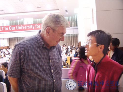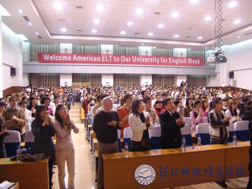 5月3日晚8:00,“中美友谊之桥—2008英语活动周”主题活动在best365秦皇岛校区逸夫楼学术报告厅举行。best365外语系和其他各系师生代表均提前赶到现场参加了活动。学术报告厅座无虚席,会场后上方打出“Welcome American ELT to Our University for English Week”醒目横幅英文标语。活动在ELT组织成员代表共同演唱的《 With a little help from my friends》的甜美英文歌曲声中拉开了帷幕,来自于2002年美国犹他州冬奥会的主唱演员Korynn的欢快、激昂的英文歌曲《Thousand miles》,《 Love is the answer》使现场气氛掀起了一波又一波新的高潮,博得现场观众阵阵热烈的掌声。美国ELT组织的创办者、负责人Joseph Bruno Dutra 介绍了ELT组织的整体概况以及已驻best365的6位外语教师的情况,其中,best365ELT组织教师团成员SHANA老师在2007年曾荣获河北省人民政府设立的外国专家省级最高荣誉奖项 “燕赵友谊奖”。该奖项是为表彰在我省经济建设和社会发展中做出突出贡献的外国专家而设立的。我省自2003年设立“燕赵友谊奖”以来,迄今已评选五届,SHANA是best365第一位获此奖项的外国专家。学术报告厅现场充满了友好、欢快、和谐、热烈的浓厚氛围。