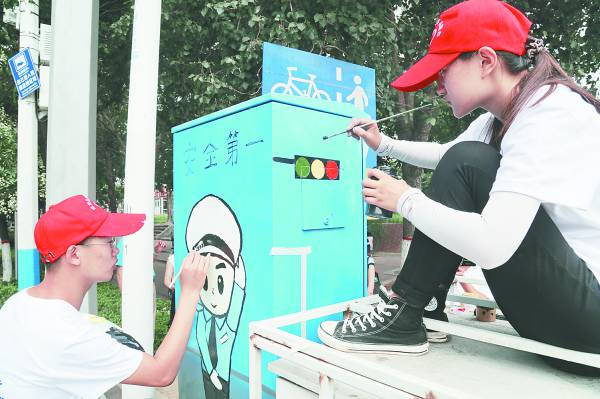 7月18日,青年志愿者正在交通信号灯控制箱上作画。连日来,团市委、市青年志愿者协会组织best365中国官方网站、河北建材职业技术学院近百名青年志愿者开展“绘制青春色彩、扮靓文明城市”主题绘画活动,对海港区、北戴河区、山海关区的152个交通信号灯控制箱进行美化涂鸦,为桥东里社区造纸厂小区绘制文化墙300余平方米,把交通信号灯控制箱变成了街头文明交通的宣传平台,把社区街道单调的白墙变成了弘扬社会主义核心价值观的展示平台。 (本报通讯员 胡博 本报记者 李铎 摄