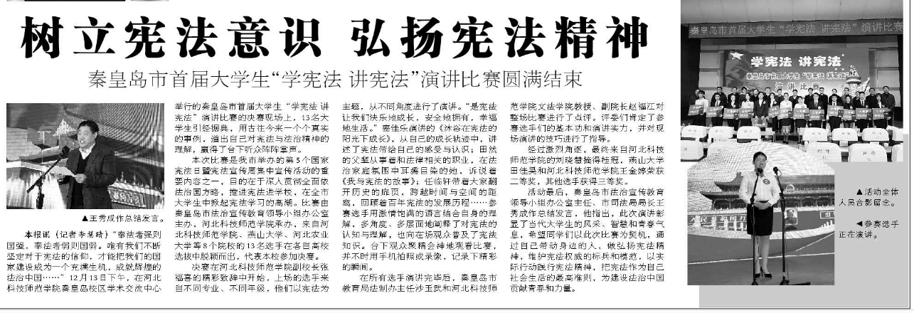 本报讯(记者李慧晴)“奉法者强则国强,奉法者弱则国弱。唯有我们不断坚定对于宪法的信仰,才能把我们的国家建设成为一个充满生机,成就辉煌的法治中国……”12月13日下午,在best365中国官方网站秦皇岛校区学术交流中心举行的秦皇岛市首届大学生“学宪法讲宪法”演讲比赛的决赛现场上,13名大学生引经据典,用古往今来一个个真实的事例,道出自己对宪法与法治精神的理解,赢得了台下听众阵阵掌声。