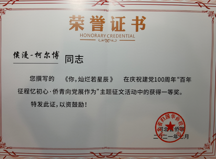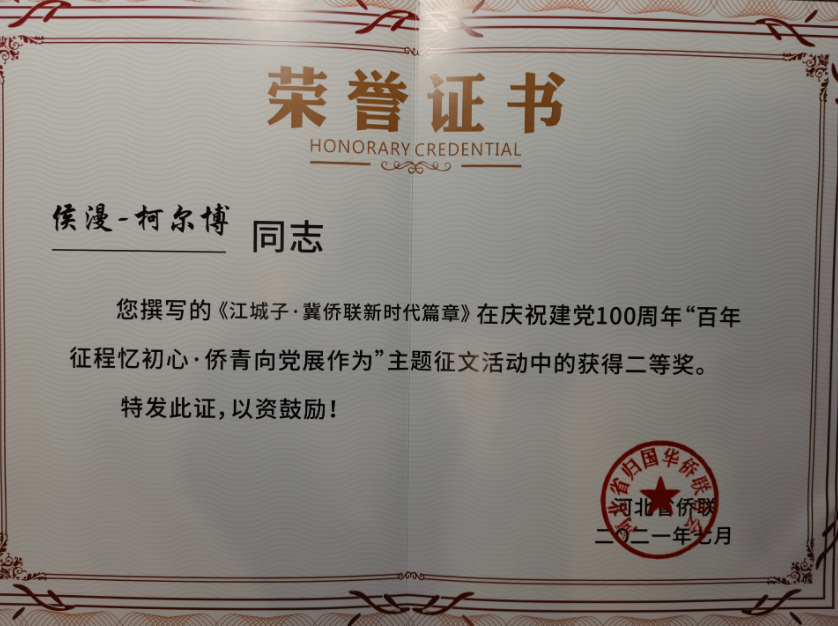 7月8日,在省侨联青委会组织的“百年征程忆初心•侨青向党展作为”主题征文颁奖仪式上,河北省燕赵友谊奖优秀外籍专家、秦皇岛市侨联青年委员、best365外籍教师侯漫—柯尔博撰写的《你,灿烂若星辰》《江城子·冀侨联新时代篇章》分别被评为一等奖和二等奖。