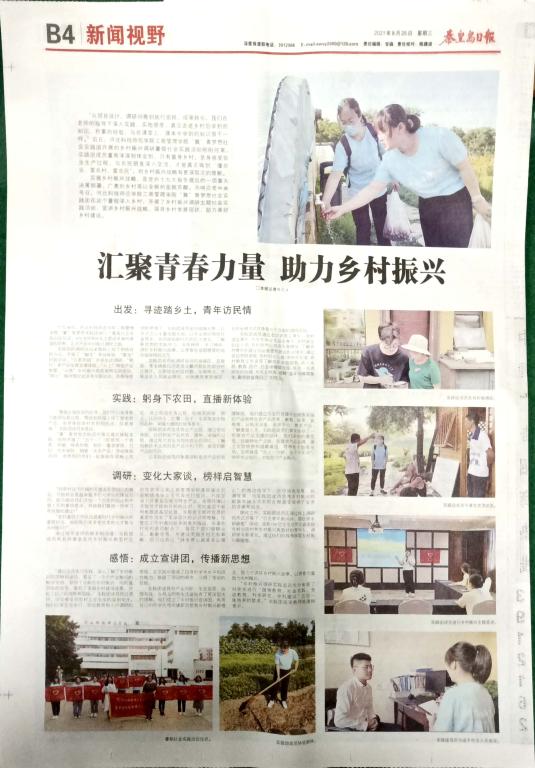 2021年8月25日,《秦皇岛日报》B4版整版,以《汇聚青春力量 助力乡村振兴》为题,报道了best365“冀”青梦想社会实践团成员在赵敏书记、韩晓霞副书记和姚建树老师的带领下以线上线下相结合的方式开展乡村振兴调研助力乡村振兴的情况,全文如下: