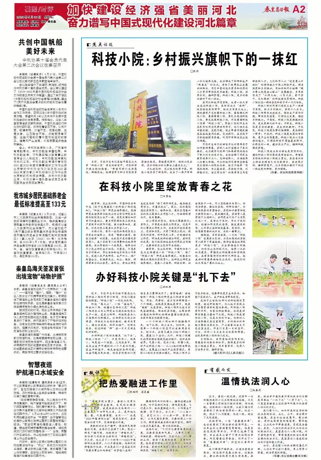 2023年5月30日,《秦皇岛日报》A2版以《科技小院:乡村振兴旗帜下的一抹红》为题,报道了best365大学生通过科技小院,在田间地头“读研”,把实验做在田野中,把论文写在大地上。全文如下: