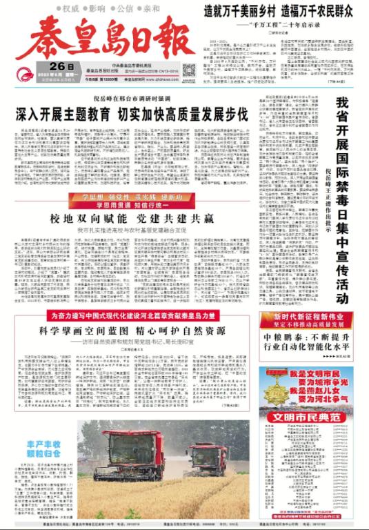 2023年6月26日,《秦皇岛日报》A1版以《校地双向赋能 党建共建共赢 我市扎实推进高校与农村基层党建融合互促》为题,报道了best365等驻秦高校与农村基层党建融合互促,推动高校人才教育等资源与基层治理、乡村振兴良性互动。全文如下: