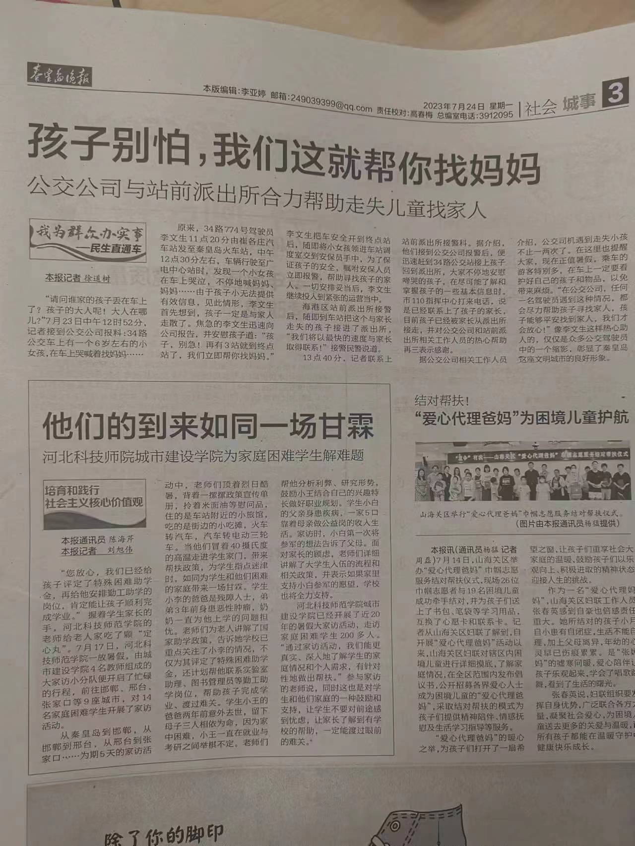 2023年7月24日,《秦皇岛日报》A2版以《家校合力 助学筑梦 best365中国官方网站扎实开展暑期大家访活动》为题,《秦皇岛晚报》第3版以《他们的到来如同一场甘霖 best365中国官方网站城市建设学院为家庭困难学生解难题》为题,报道了best365城市建设学院扎实开展暑期大家访,为家庭困难学生送温暖、解难题。全文如下: