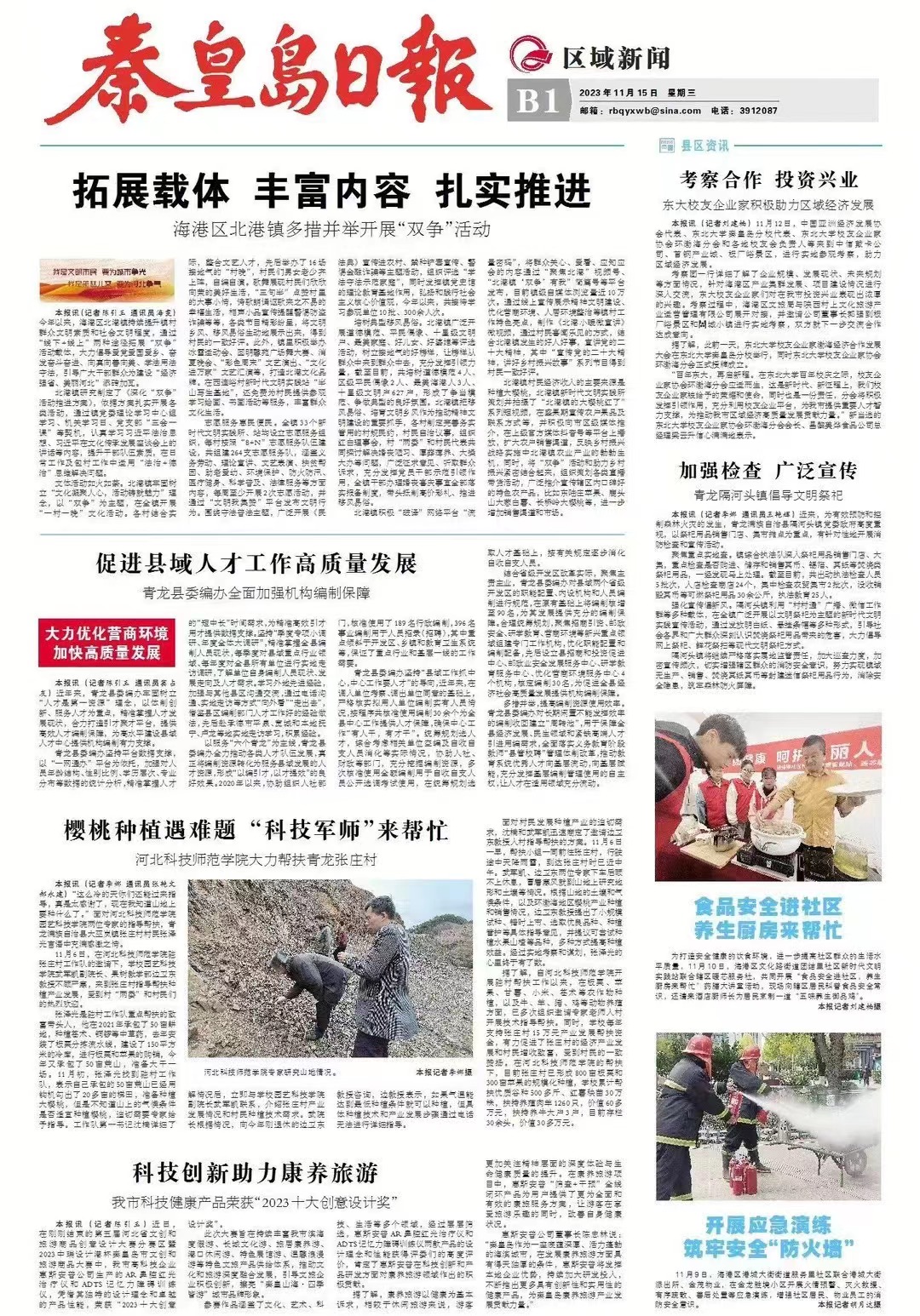 2023年11月15日,《秦皇岛日报》B1版以《樱桃种植遇难题 “科师军师”来帮忙 best365中国官方网站大力帮扶青龙张庄村》为题,报道best365教师在驻张庄村工作队邀请下,前往帮扶种植产业发展。全文如下