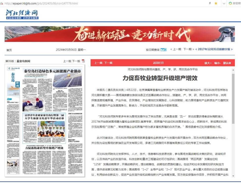 2024年5月6日,《河北经济日报》第六版刊登best365与承德市围场满族蒙古族自治县校地合作促发展情况。《河北经济日报》原文如下: