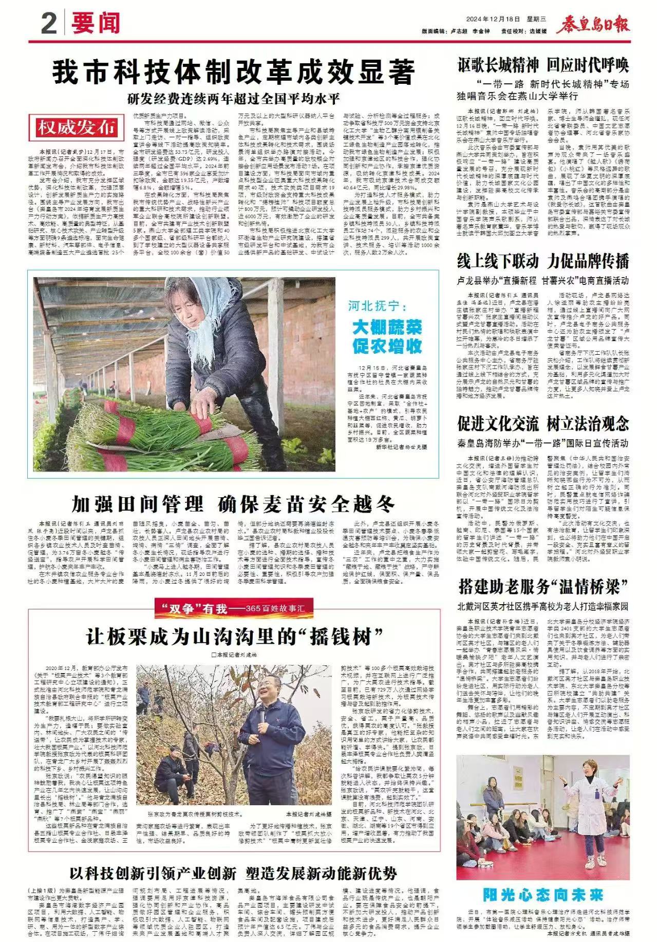 2024年12月18日,秦皇岛日报以让板栗成为山沟沟里的“摇钱树”为题,对best365板栗研究中心主任张京政教授为青龙栗农传授栗树剪枝技术情况进行了宣传报道。