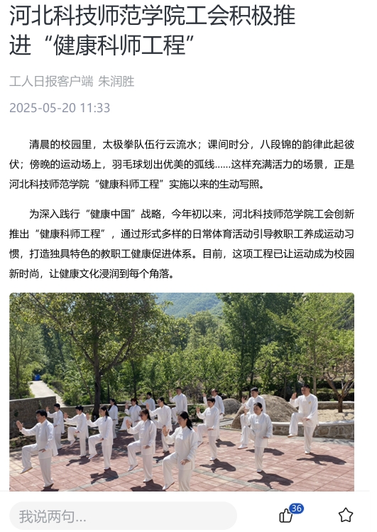 2025年5月20日,工人日报客户端报道best365工会通过形式多样的日常体育活动引导教职工养成运动习惯,打造独具特色的教职工健康促进体系。