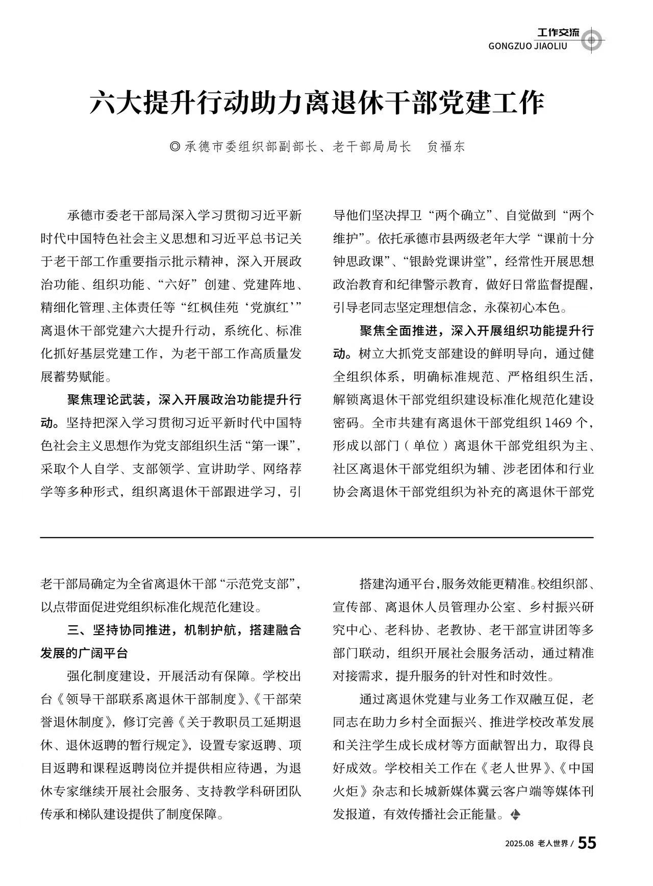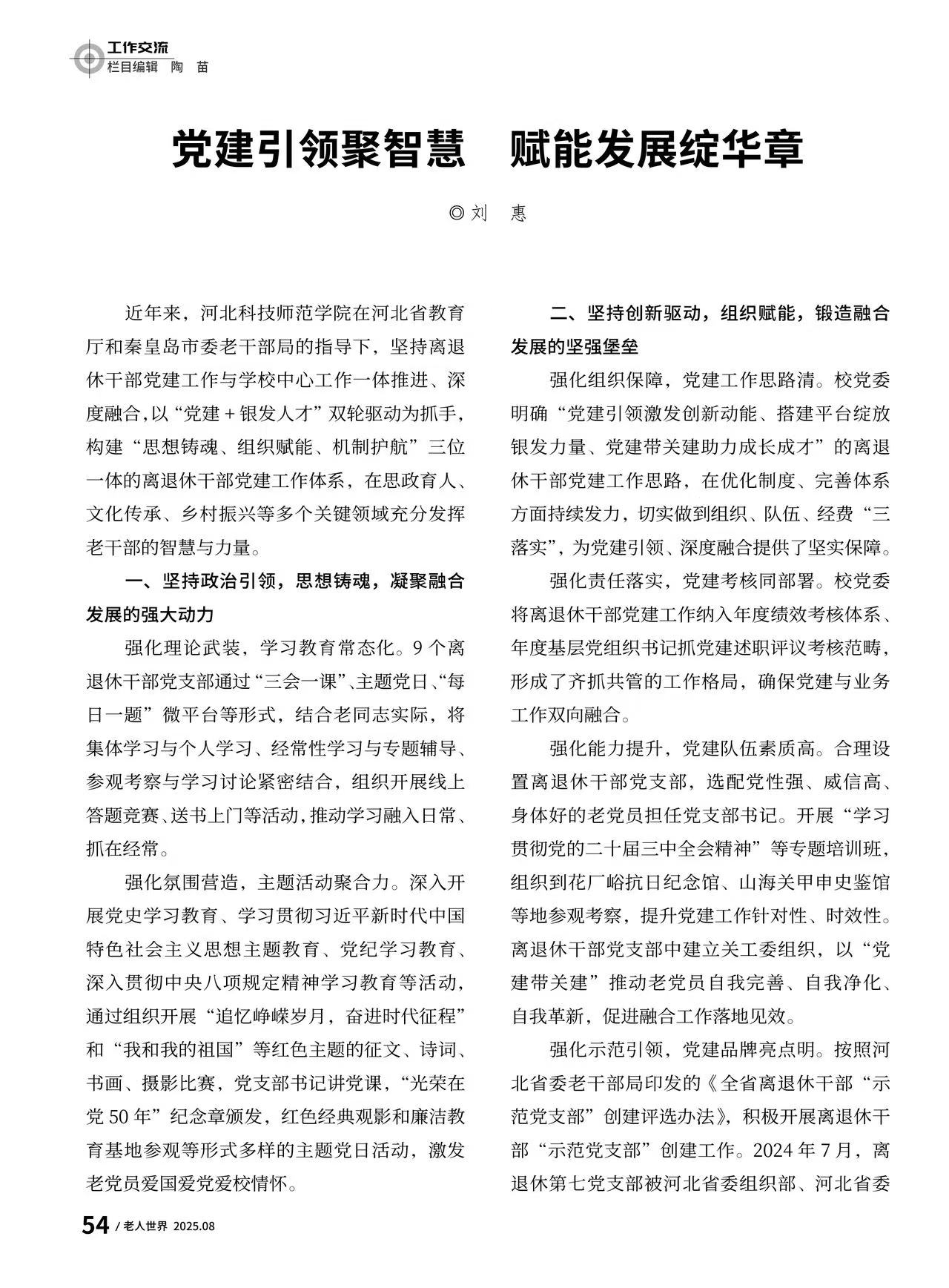近日,由中共河北省委老干部局主管的《老人世界》杂志2025年第八期“工作交流”栏目,刊发了best365离退办刘惠撰写的《党建引领聚智慧赋能发展绽华章》一文,集中展现了best365离退休干部党建工作的特色成果与实践经验。