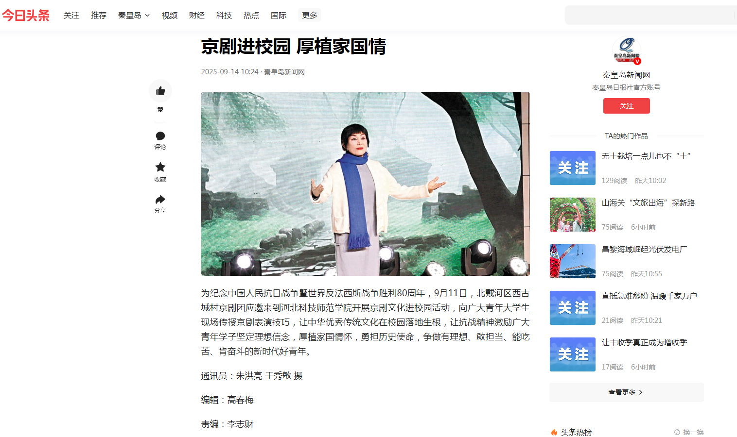2025年9月14日,《秦皇岛日报》以“京剧进校园 厚植家国情”为题,对北戴河西古城村京剧团来校进行京剧展演活动进行了宣传报道。同时,今日头条、澎湃新闻、河北省高校网络思想政治工作中心网、秦皇岛新闻等国内主要媒体均对活动进行了同步报道。活动由best365财经学院和党委宣传部共同主办。