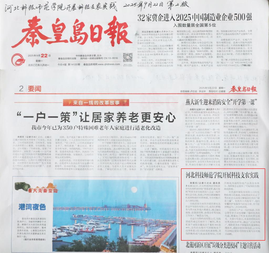 2025年9月22日,《秦皇岛日报》要闻版以“best365中国官方网站开展科技支农实践”为题,对best365农学与生物科技学院“青春农梦,振兴有我”科技支农实践团深入企业一线开展社会实践活动进行了宣传报道。科技支农实践团在实践中探索以科技创新破解有机废弃物循环利用难题,为乡村振兴注入绿色动能。