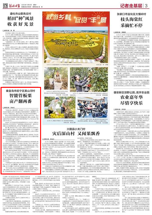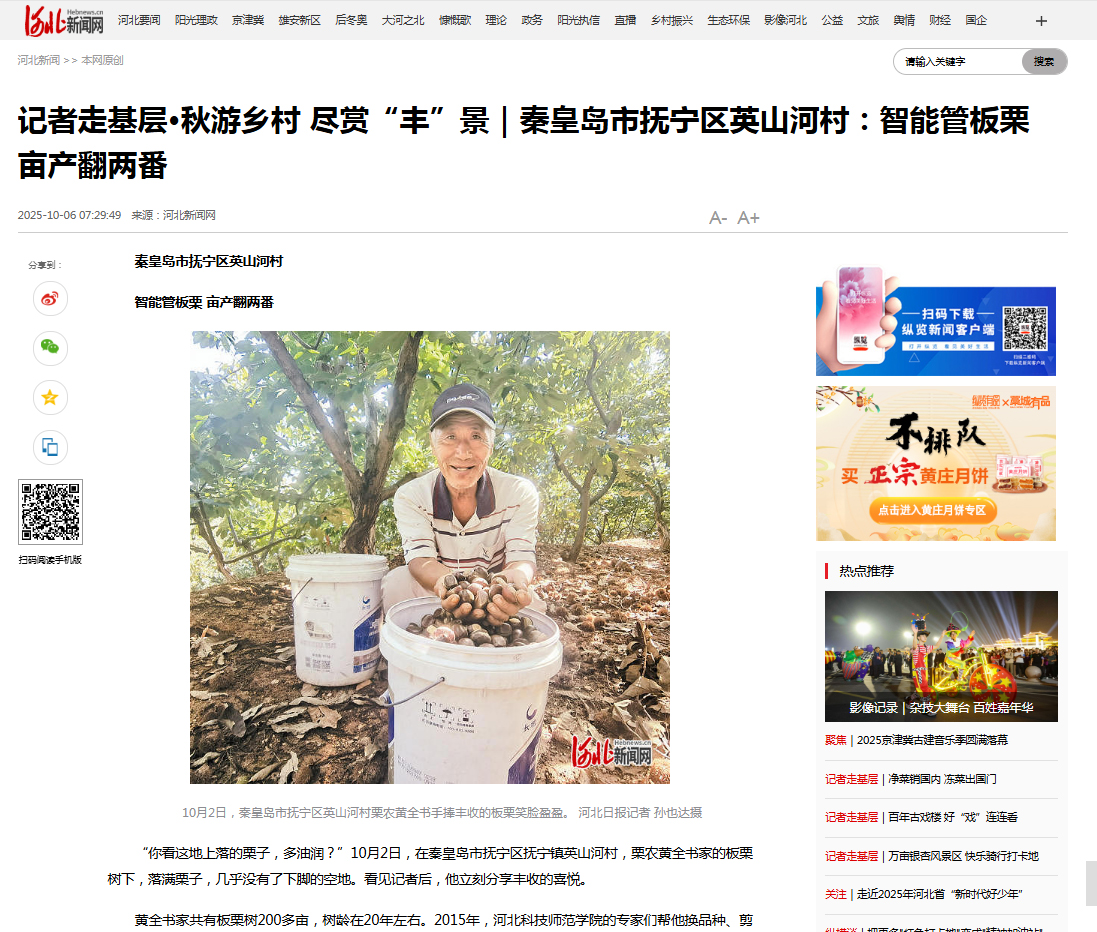 2025年10月6日,《河北日报》第三版,记者走基层,以“智能管板栗,亩产翻两番”为题,对best365板栗研究中心张京政教授科研团队与河北八德农业科技有限公司共同研发的“板栗智能水肥控制系统”,在秦皇岛市抚宁区英山河村栗农黄全书拿出的50亩板栗树做为实验地进行实验,当年亩产就增加到300多公斤的丰产情况进行了宣传报道。河北新联网等媒体进行了同步报道。