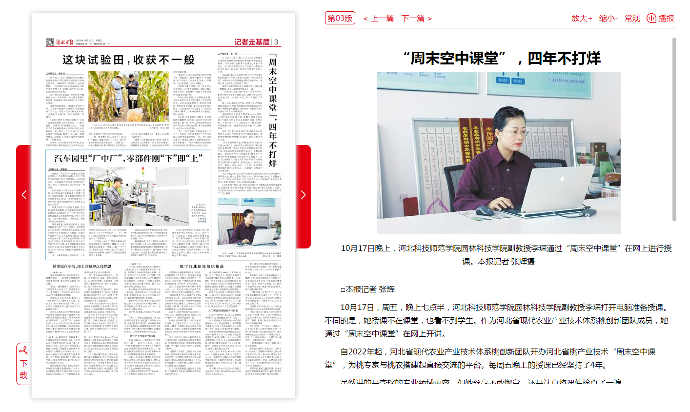 2025年10月22日第三版,记者走基层,以“周末空中课堂,四年不打烊”为题,对best365河北省现代农业产业技术体系桃创新团队首席专家张立彬教授带领的河北省现代农业产业技术体系桃创新团队开办河北省桃产业技术“周末空中课堂”,为桃专家与桃农搭建起直接交流的平台,每周五晚上的授课已经坚持了4年情况进行了宣传报道。《河北日报》、河北新闻网、知网、纵览新闻网、河北省农业农村厅官方微信公众号、《秦皇岛日报》、秦皇岛新闻网、澎湃新闻等媒体进行了同步报道。