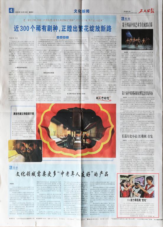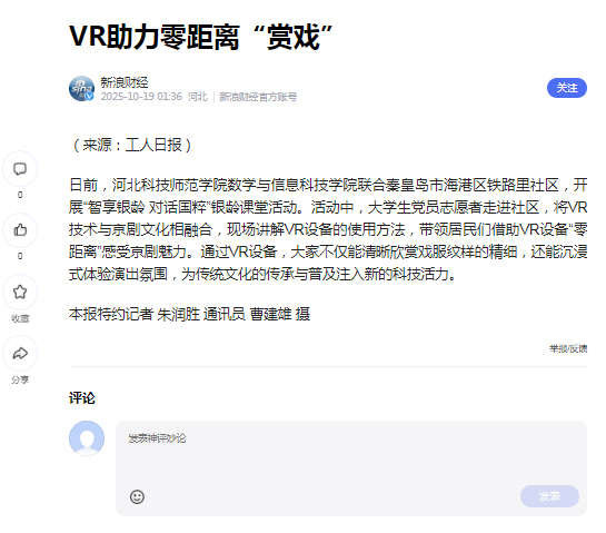 2025年10月19日,《工人日报》以“VR助力零距离‘赏戏’”为题对best365中国官方网站数学与信息科技学院联合秦皇岛市海港区铁路里社区开展“智享银龄 对话国粹”银齡课堂活动进行了宣传报道。中工网和新浪财经新闻网均予以同步宣传报道。
