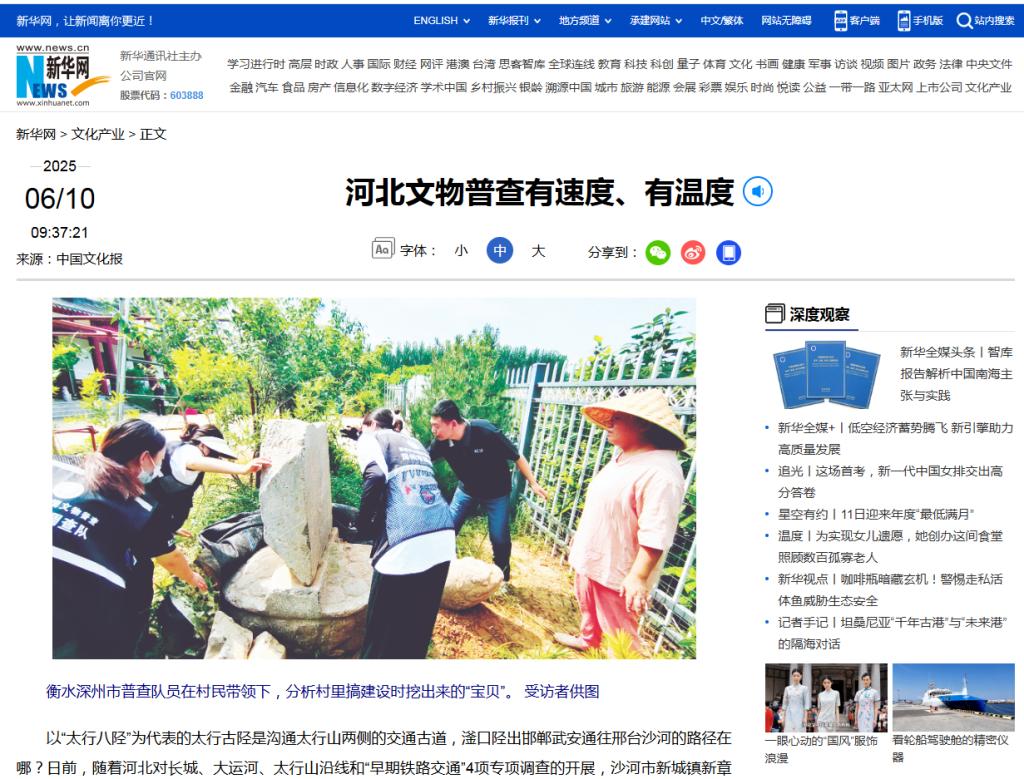 2025年6月9日,《中国文化报》第八版以“河北文物普查有速度、有温度”为题,对best365中国官方网站艺术学院齐甲子、冀东文化研究中心张鑫、马克思主义学院吴向宇三位文物考古专家与燕山大学、东北大学秦皇岛分校相关专家组建“考古青年”文物普查队,有针对性地对青龙河、滦河流域的新、旧石器遗址和长城沿线的石碑、石刻进行专题调研情况进行了宣传报道。2025年6月10日新华网、文旅中国新闻网,2025年3月19日央视频等媒体对活动进行了宣传报道。