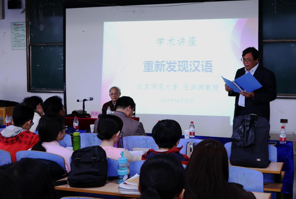 2017年4月13日下午,文法学院、研究生部特邀北京师范大学任洪渊教授来best365做“重新发现汉语”专题讲座。秦皇岛市海港区文联秘书长赵永红,秦皇岛市广播电台播音部主任冯颖,国家一级作家、秦皇岛市文学创作院院长张辉利以及文法学院相关领导、任课教师与汉语言文学专业、汉语国际教育专业本科生一起听取了讲座。