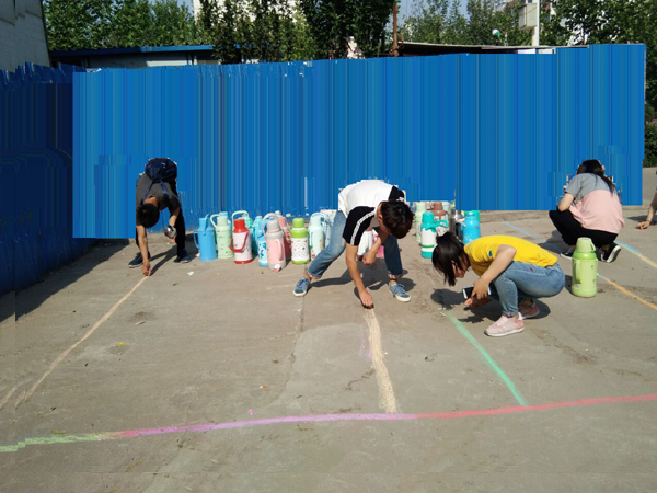 由于学校学生较多,打开水也是同学们的一个重要生活项目。但是很多同学为了自己拿取暖壶方便,都随手把暖壶放在了开水房附近的道路两旁,不但影响通行,也造成了小小的安全隐患,如丢失、破损。就此,建筑装饰工程专业16级的青年志愿者们发动起来,把暖壶归拢好,并画上格子,给暖壶一个可以安全放置的地方。