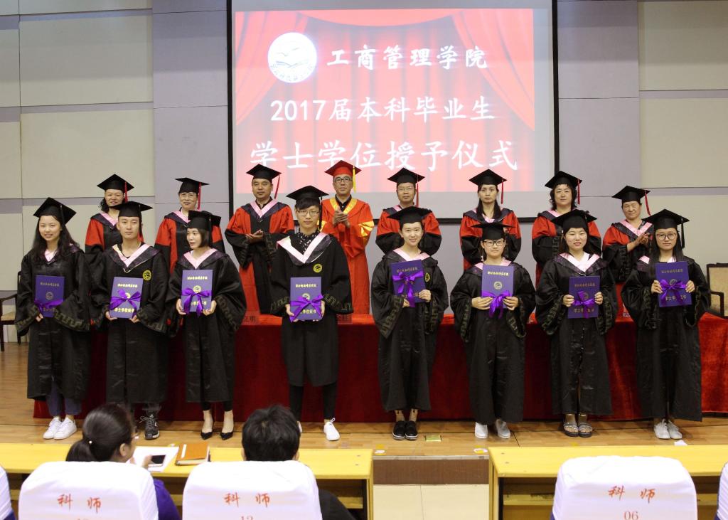 2017年6月13日上午9:00,工商管理学院2017届毕业生学士学位授予仪式在学术报告厅隆重举行。工商管理学院党政领导、各学科专业带头人、毕业班辅导员(班主任)和2017届毕业生及在校生代表参加了仪式。