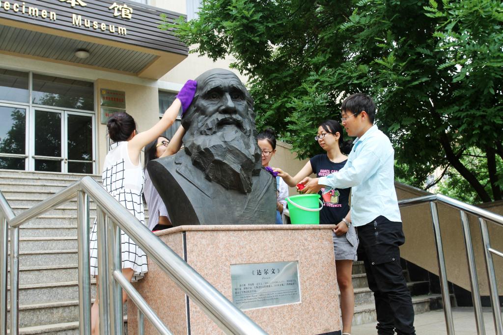 毕业生党员认真清洁了生物标本、墙壁上名人画像、科普宣传展板和达尔文雕像,对楼层走廊的环境设施进行了彻底的卫生清洁。开展的活动受到了标本馆负责人的好评。