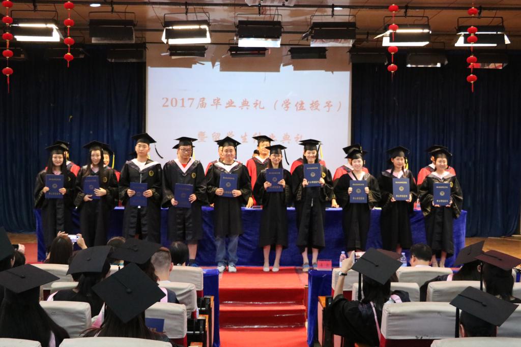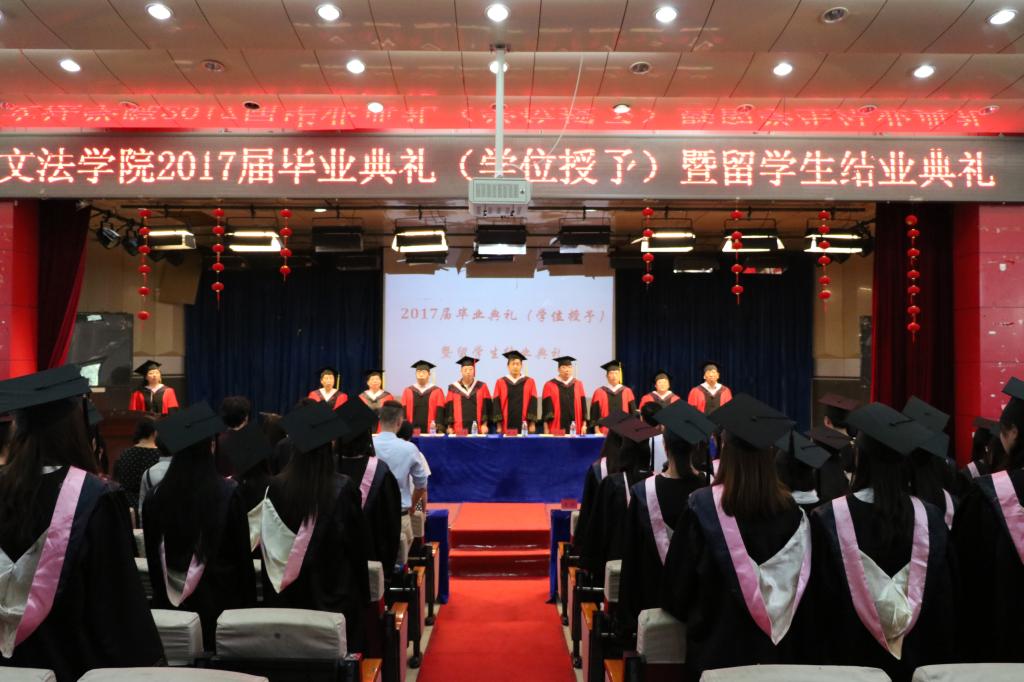 6月14日上午,文法学院在开发区学术报告厅举行了2017届毕业典礼(学位授予)暨留学生结业典礼。学院党政领导、国际合作与交流处有关领导、各教研室主任、各位辅导员班主任老师出席了仪式。