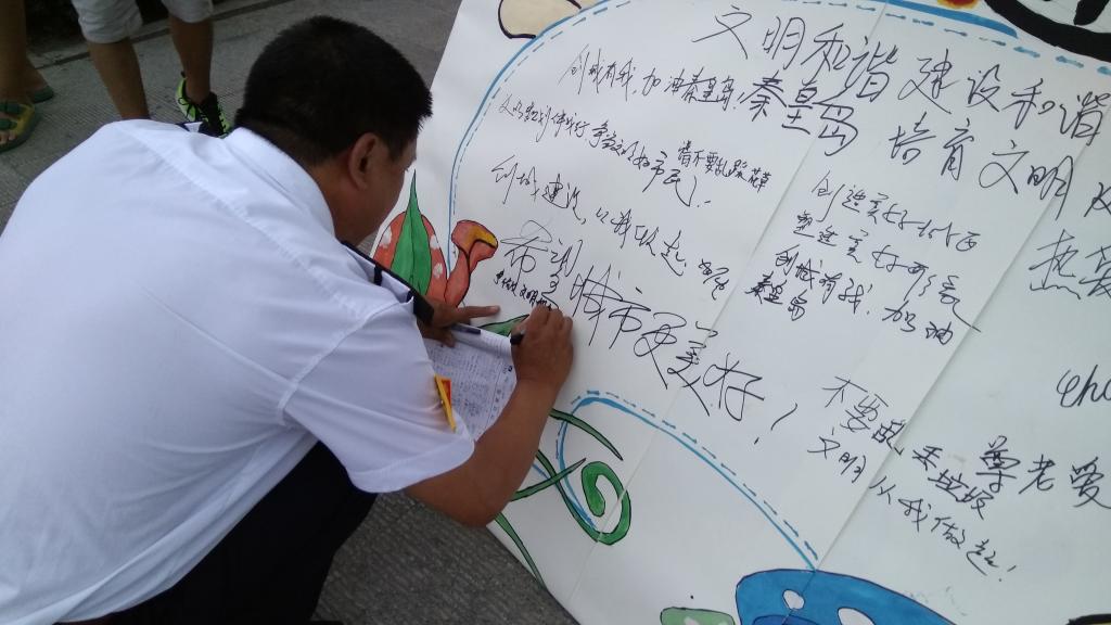 一座城市的文明,体现在市民的一举一动上。随着创建全国文明城市工作的不断推进,秦皇岛市创城氛围日益浓厚,为提高社区居民群众对创城工作的知晓率,提升社区居民文明素质,营造创城的良好氛围,河北科师“护城使者”实践团积极行动起来,绘制宣传“创城”标语板,在白塔岭街道御品星城社区开展“人人参与创城,处处彰显文明”创城宣传活动。